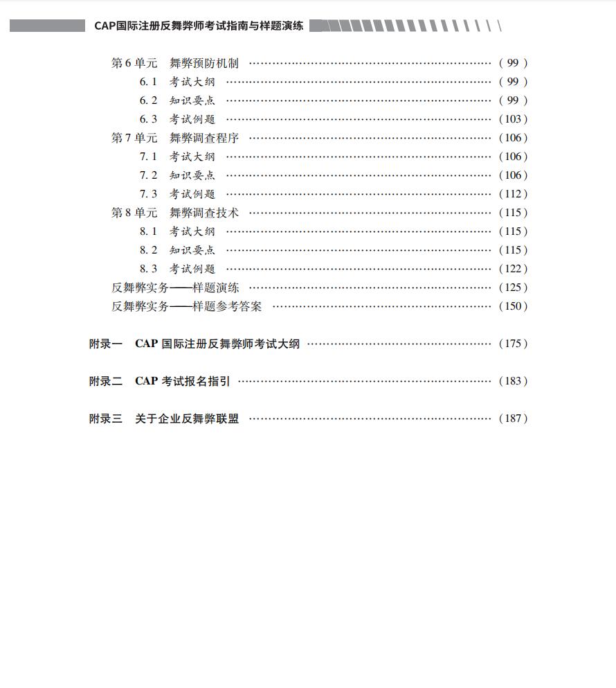 图书介绍:本书为国际注册反舞弊师CAP考试习题集,内容包括每部分考试大纲、知识要点、试题举例(含精解)、样题演练、参考答案和解题思路,收录能力框架、职业道德规范、考试介绍和报名指引等。
